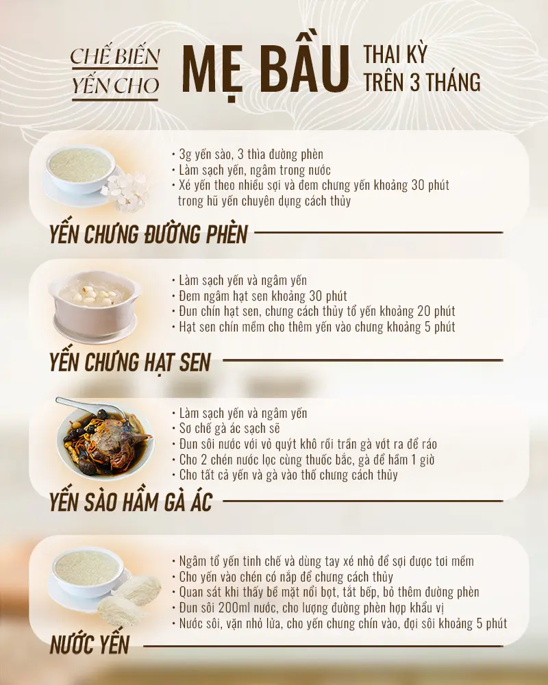 - Trong tam cá nguyệt cuối (từ tháng 7 trở đi): Hàm lượng yến nạp vào cơ thể nên giảm xuống còn 5 gram và chỉ sử dụng tối đa 3-4 lần/tuần. Ngoài ra, mẹ cần chú ý xem cơ thể có gì bất thường không, nếu cảm thấy không ổn khi ăn thêm yến, mẹ nên hỏi ý kiến bác sĩ về tình trạng này.