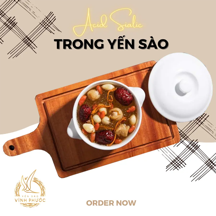 Yến sào chưng sẵn cao cấp Vĩnh Phước cũng là một trong những thực phẩm có nhiều giá trị dinh dưỡng cao. Với sự đa dạng về hương vị, kết hợp thêm nhiều nguyên liệu bổ quý khác như: nhân sâm, đông trùng hạ thảo, hạt sen, hạt chia, táo đỏ, long nhãn, Saffron và collagen,… Tạo nên món ăn dinh dưỡng, thơm ngon, tiện lợi và giàu axit syalic. Đặc biệt, giá thành phù hợp với điều kiện của nhiều gia đình nữa. Vì thế, bạn có thể cân nhắc để lựa chọn sử dụng nhằm tăng cường axit syalic cho cơ thể.