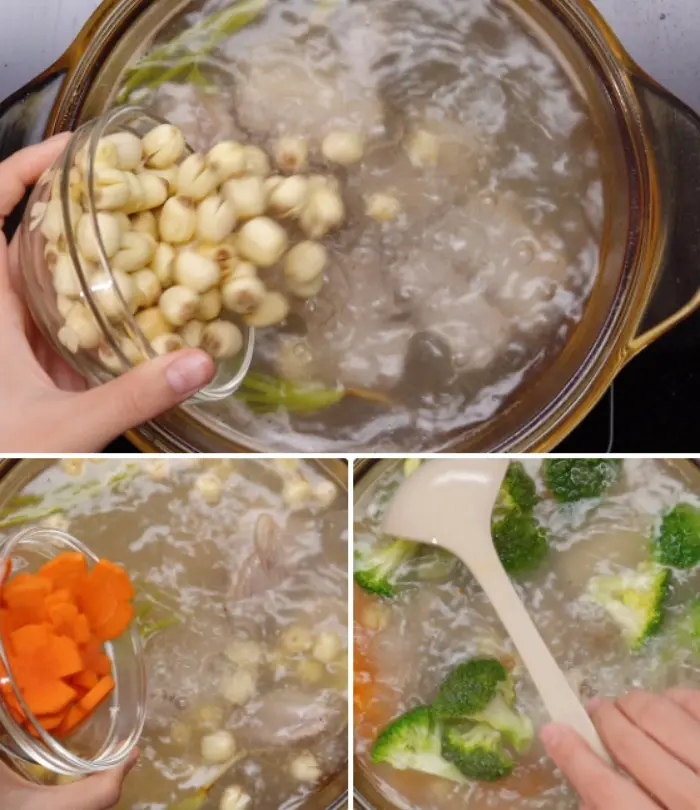- Cho gạo, đậu xanh, hạt sen vào nồi nước xương hầm khoảng 30 – 40 phút và nấu thành cháo.