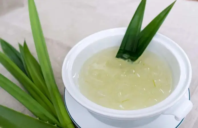 Cho lần lượt các nguyên liệu vào thố: lá dứa, nha đam, yến tươi và đổ thêm nước sôi để nguội đến khi ngập yến (không đổ quá đầy).