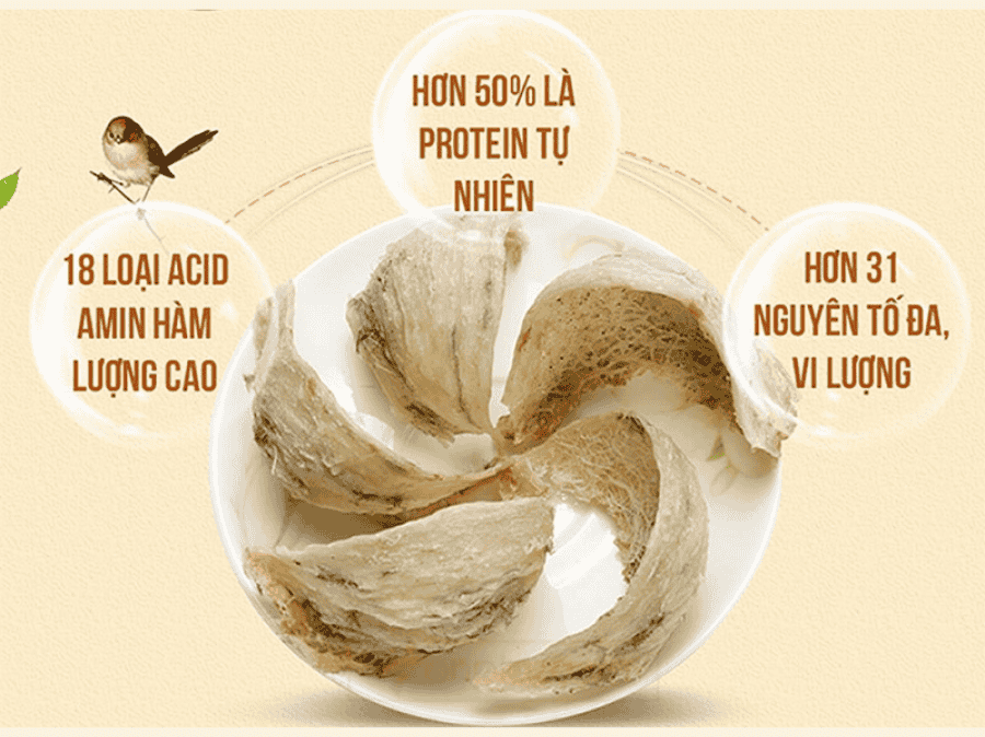 Yến sào được tạo thành từ dịch tiết của chim yến, giàu protein tự nhiên và các vi chất thiết yếu. Thành phần dinh dưỡng của 100g yến sào khô bao gồm: