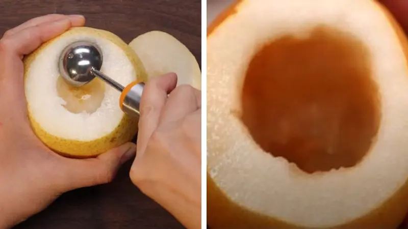 Bước 2: Rửa sạch trái lê. Cắt một phần nhỏ ở phần dưới cùng của trái lê để nó có thể nằm gọn trong tô. Cắt phần trên cùng của trái lê để làm nắp. Khoét rỗng ruột của trái lê. Phần ruột lê thái hạt lựu.