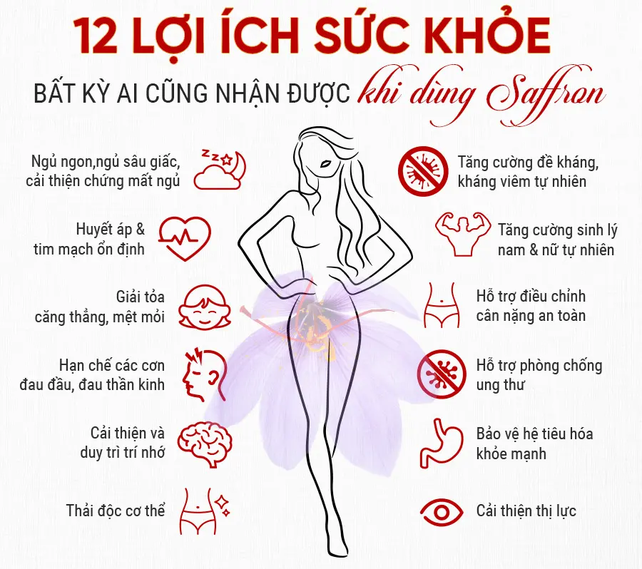 Cải thiện chứng mất ngủ, chất lượng giấc ngủ. Trong nhụy hoa nghệ tây chứa Croin và Safranal, có tác dụng cải thiện chứng mất ngủ và cơn đau đầu.