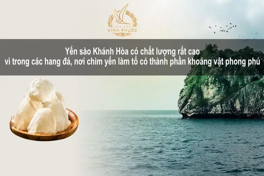 Yến sào Khánh Hòa có chất lượng rất cao không chỉ bởi là nơi sinh sống của loài yến quý mà còn vì thành phần khoáng vật phong phú trong các hang đá, nơi chim yến làm tổ. Nguồn thực ăn cũng như môi trường tốt cũng giúp tăng hàm lượng các nguyên tố đa vi lượng có trong tổ yến.