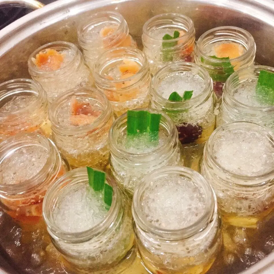Cho nước lá dứa đã nấu và yến sào vào chung trong các hũ nhỏ có đậy nắp, mang đi chưng cách thủy cho đến khi sản phẩm đạt đến độ mềm nhất định