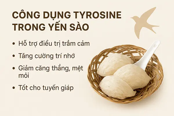 Tyrosine trong yến sào không chỉ là một thành phần quý giá tạo nên giá trị dinh dưỡng đáng kể, mà còn mang lại nhiều lợi ích quan trọng cho sức khỏe. Loại axit amin này có khả năng cải thiện trí nhớ, nâng cao tâm trạng, hỗ trợ giảm căng thẳng và tăng cường hoạt động hiệu quả của tuyến giáp.