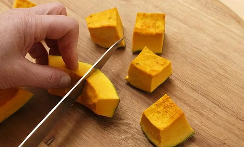 Bí đỏ gọt bỏ vỏ và ruột bí, rửa sạch và cắt hạt lựu hoặc cắt miếng nhỏ vừa ăn.