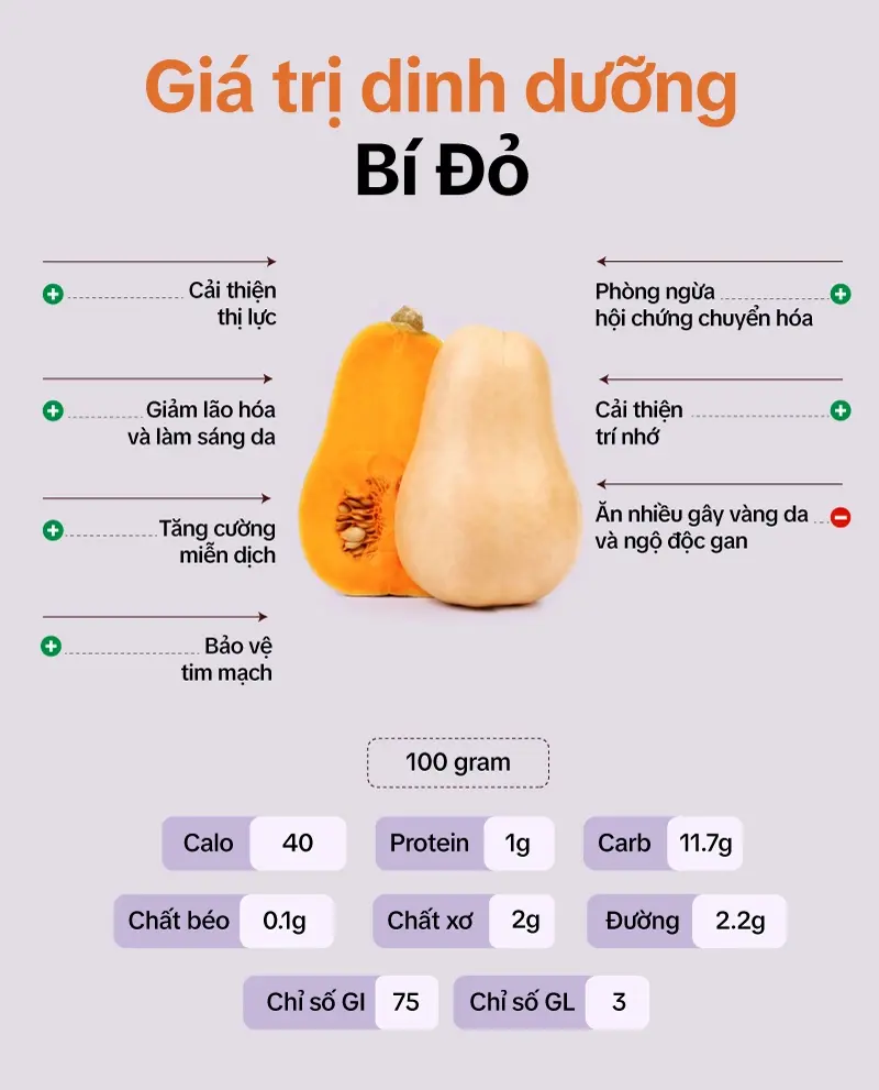 Bí đỏ có nhiều chất dinh dưỡng hỗ trợ cải thiện hệ tiêu hóa, tốt cho xương khớp, não bộ, thị giác và làn da. Đặc biệt, người có vấn đề về tim mạch có thể thêm bí đỏ vào chế độ ăn để ngăn ngừa biến chứng và hỗ trợ sức khỏe cho bệnh nhân tiểu đường.
