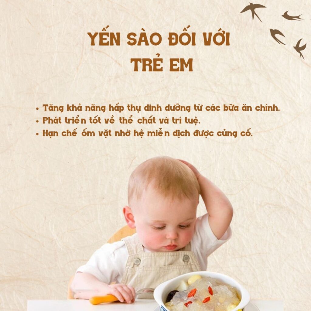 - Trẻ em từ 1 tuổi trở lên có thể bắt đầu sử dụng yến sào vì lúc này hệ tiêu hóa đã tương đối hoàn thiện.