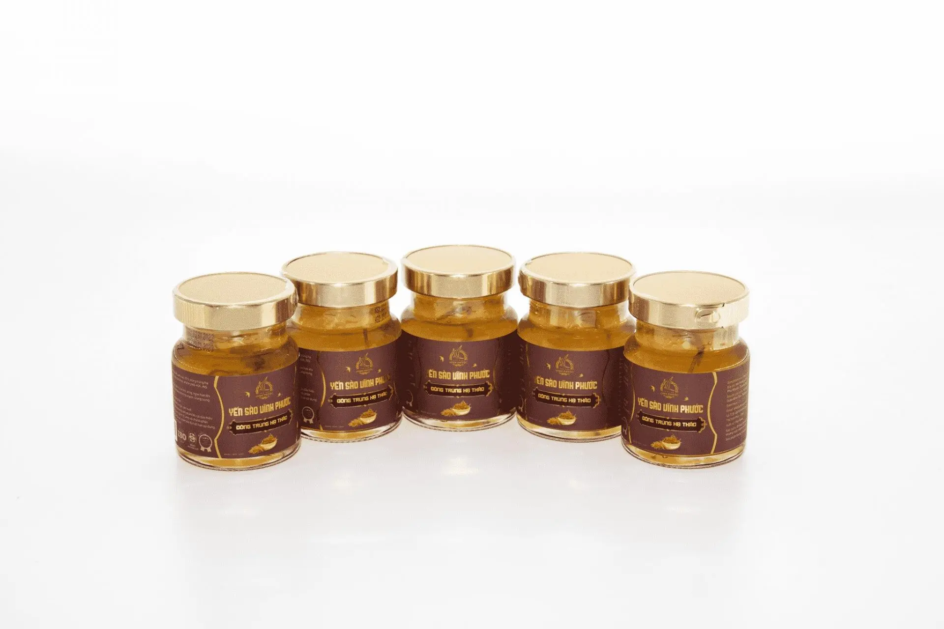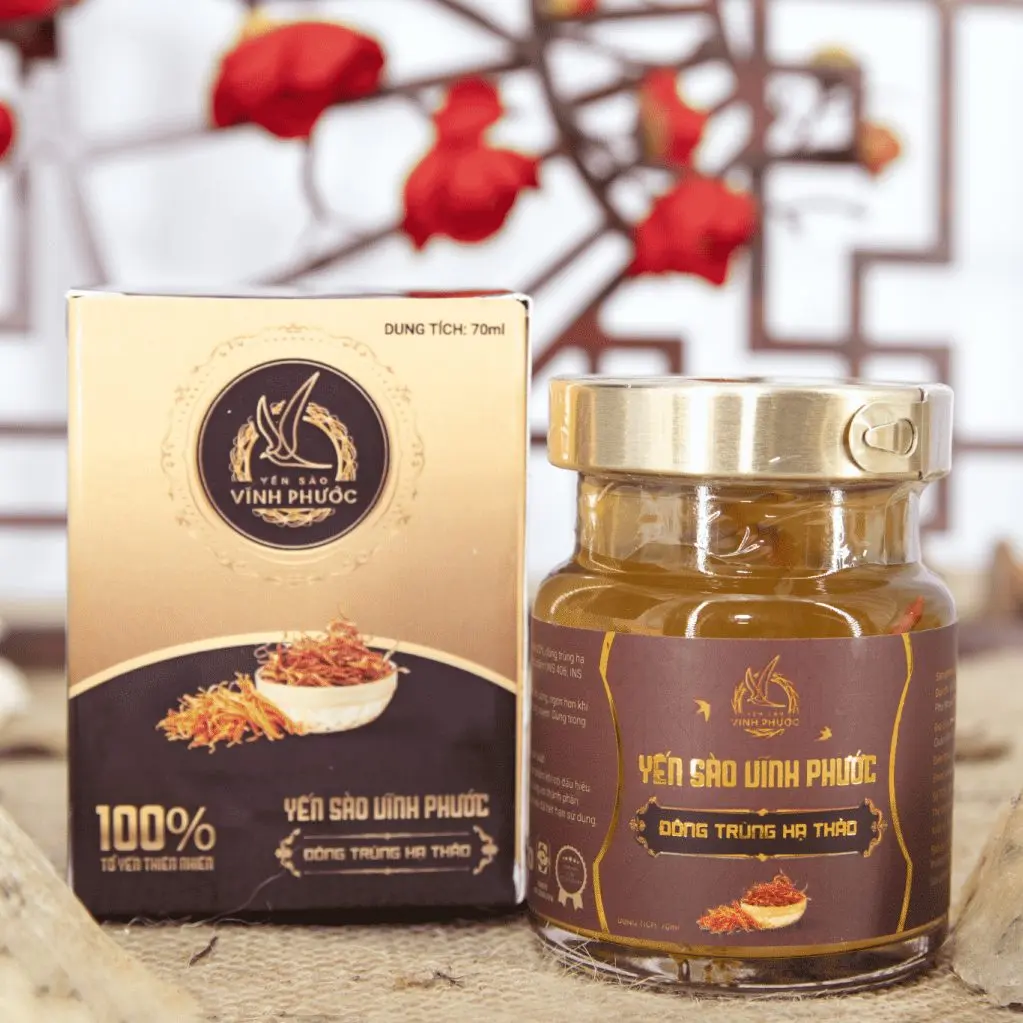 Đóng gói: Hộp 1 hũ / 5 hũ Yến Sào Chưng Đông Trùng Hạ Thảo Vĩnh Phước 70ml
