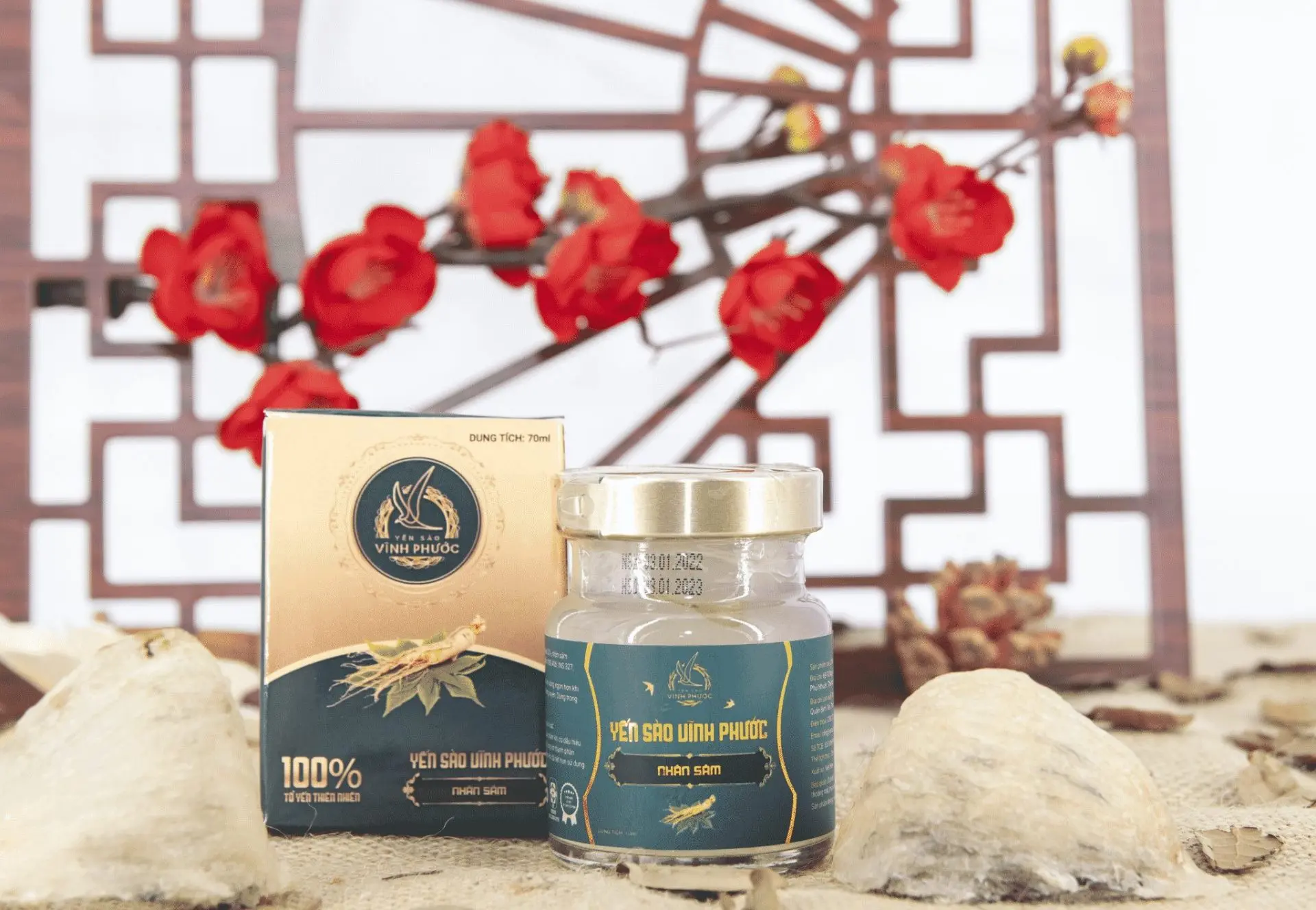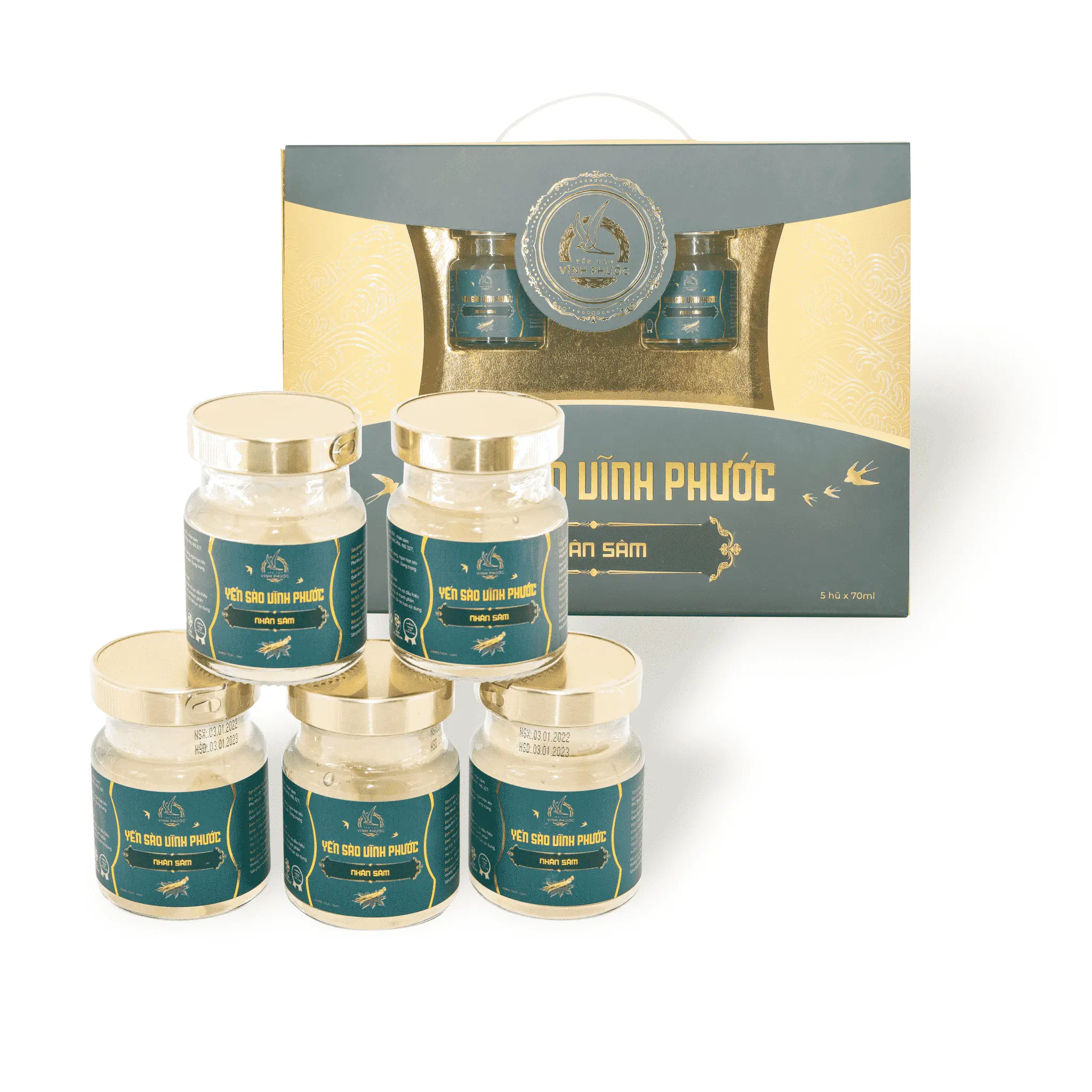 Đóng gói: Hộp 1 hũ / 5 hũ Yến Sào Chưng Nhân Sâm Vĩnh Phước 70ml