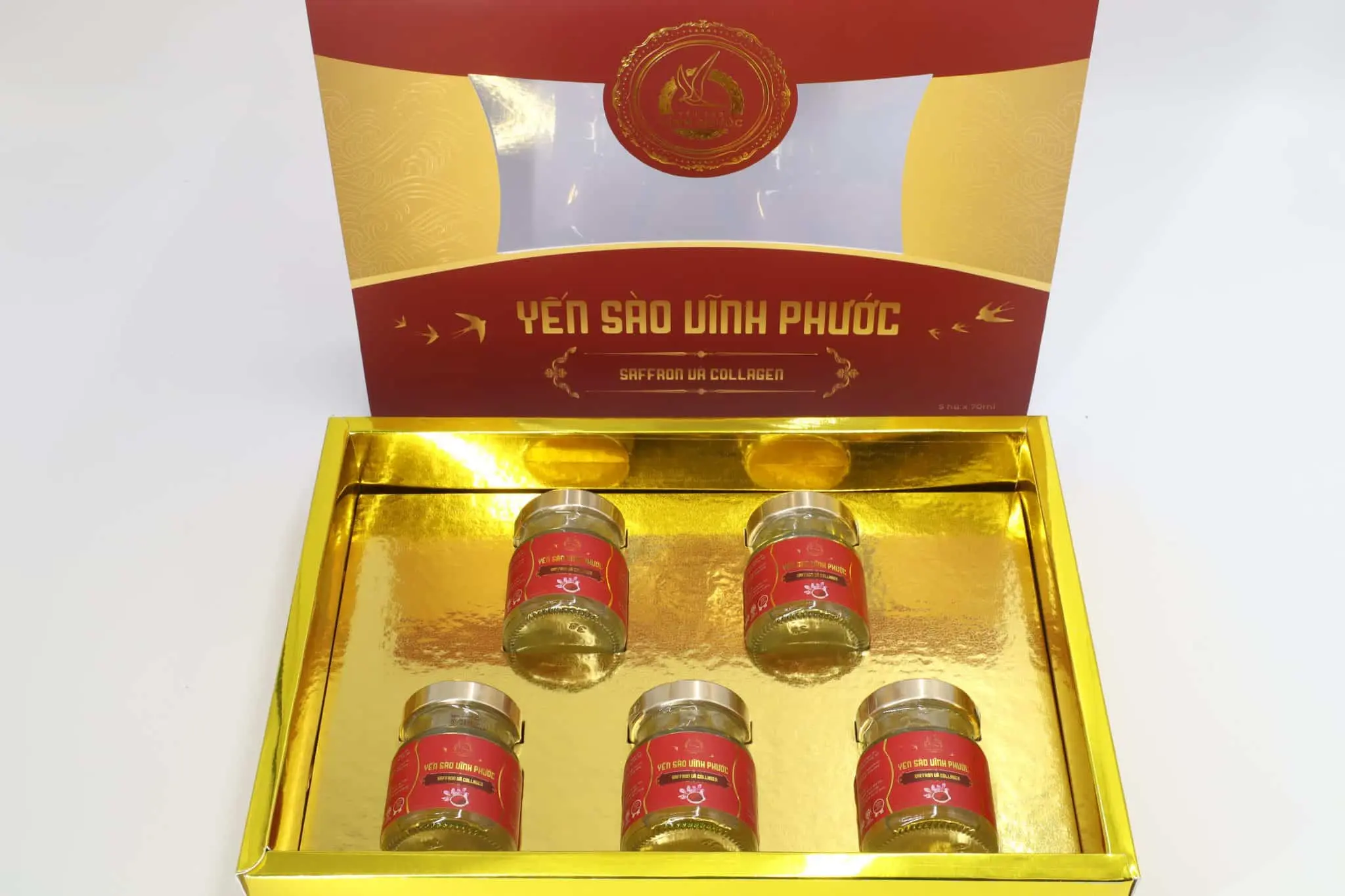 Đóng gói: Hộp 1 hũ / 5 hũ Yến Sào Chưng Saffron – Collagen Vĩnh Phước 70ml